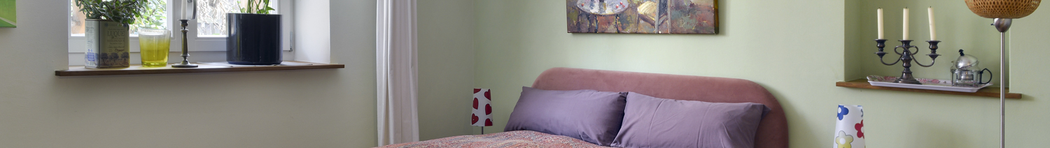 Zur Erweiterung unserer Ferienwohnungen haben wir im Souterain neben der Bibliothek das Gästezimmer „Cantina“ mit Bad eingerichtet – ein bisschen das klassische „Fremdenzimmer“. Bitte beachten Sie: Die Raumhöhe ist 2,05 m, das Fenster zum Garten 100×70 groß – bei trübem Wetter kann hier Kunstlicht nötig sein. Das gibt es aber von etlichen dezentralen Lichtquellen – von produktiv bis kuschelig.